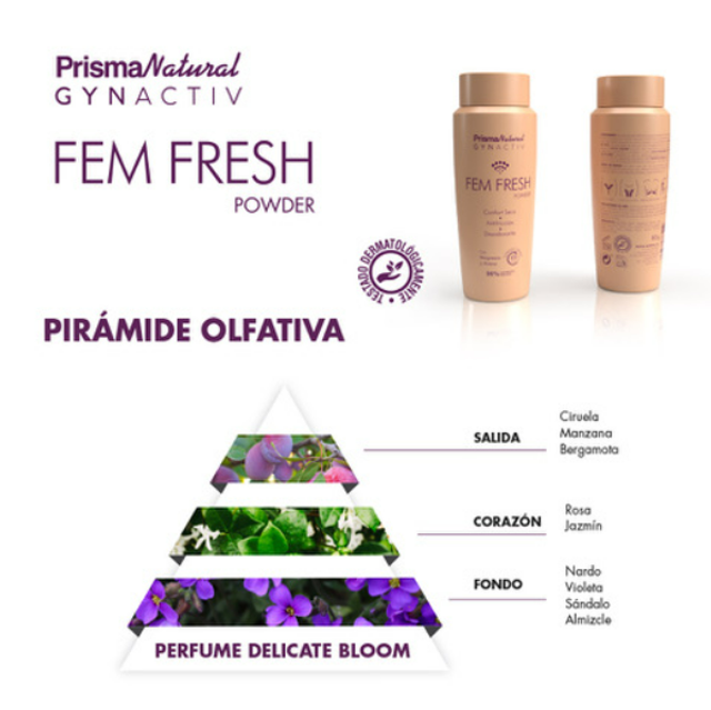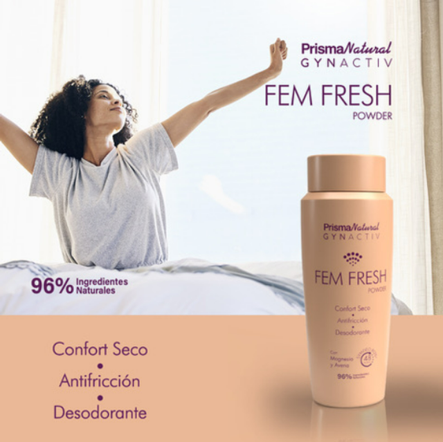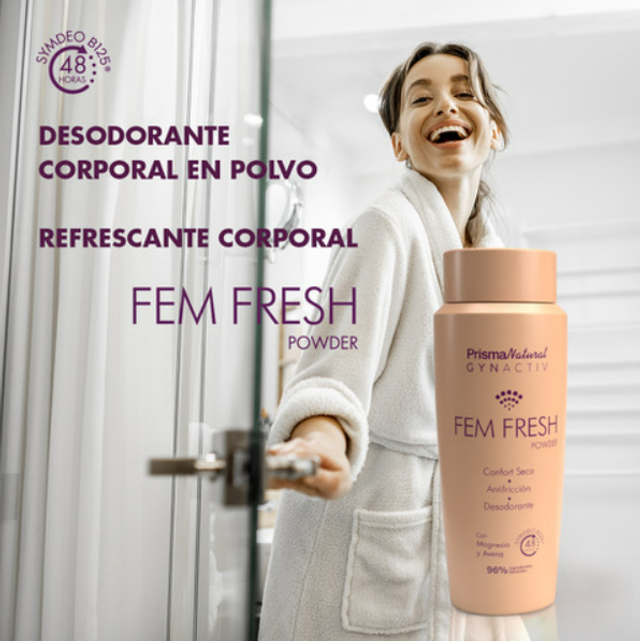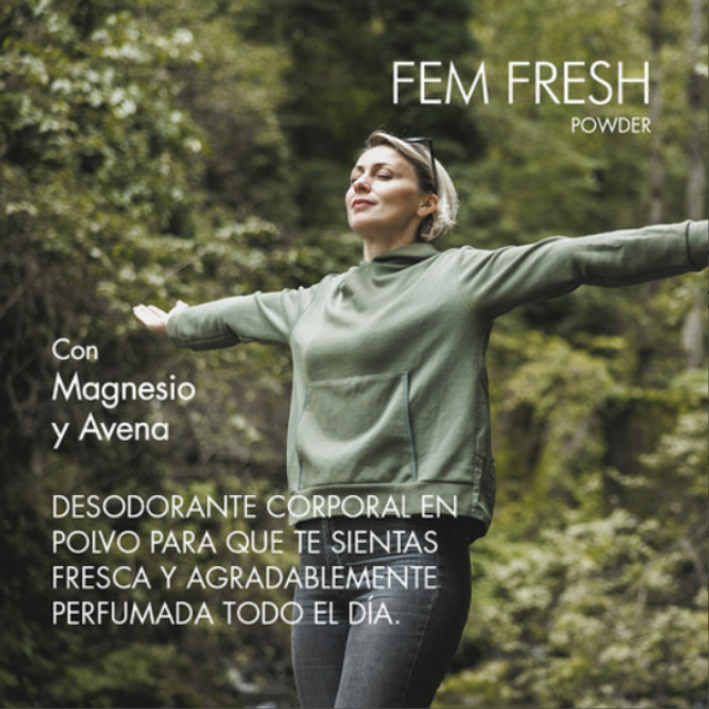 Fem Fresh Powder es un polvo desodorante corporal con delicado aroma floral a rosa y jazmín. Aporta frescor y confort durante todo el día gracias a su fórmula con almidón de maíz, que absorbe la humedad y deja una textura sedosa en la piel. Enriquecido con avena coloidal que protege, calma y respeta el microbioma cutáneo. Incluye un activo desodorante patentado “microbiome-friendly” con eficacia 48 h y acción antibacteriana. Contiene magnesio para mantener la barrera protectora natural de la piel, combatir la sequedad e hidratar en profundidad.