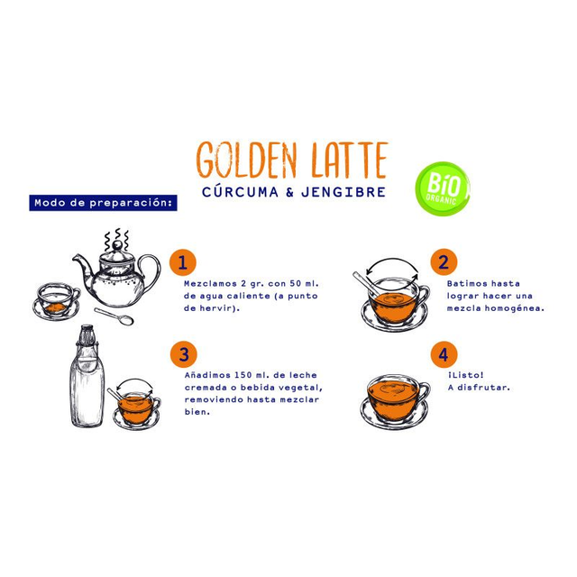 Deliciosa bebida compuesta principalmente por cúrcuma a la que acompañan el jengibre, la pimienta negra, la canela, la vainilla y el cardamomo. Se caracteriza por su sabor cremoso, terroso, con un toque picante y una pizca de dulzor. Una infusión perfecta para tomar en cualquier momento del día.