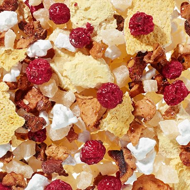 piña confitada (piña, azúcar), trozos de manzana (trozos de manzana, acidulante: ácido cítrico), gránulos de limón (maltodextrina, zumo de limón, aceite natural de limón, gelificante: alginato de sodio), cáscaras de limón, grosellas liofilizadas, aromas