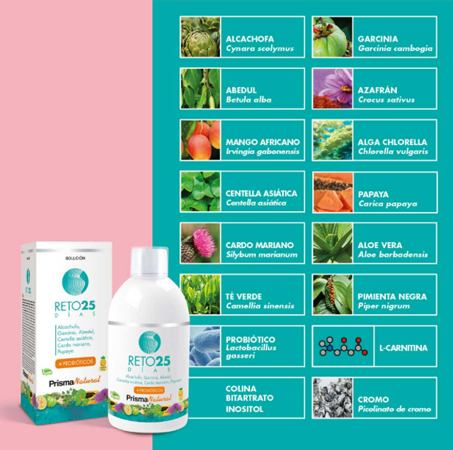 Con 17 ingredientes activos entre los que se encuentran 12 de las plantas con más propiedades reconocidas y usos ancestrales como Azafrán, Alcachofa, Té Verde, Pimienta Negra, Aloe Vera, Alga Chlorella, Mango, Cardo Mariano, Abedul, Papaya, Garcinia y Centella Asiática, además de otros activos de origen natural como Cromo, Colina, L-Carnitina, FOS y como última novedad, han incluido los probióticos Lactobacillus Gasseri, para hacerlo posicionarse como el El TODO EN UNO más completo del mercado.