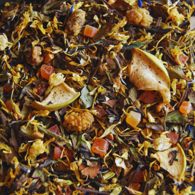 Té blanco, papaya confitada (papaya, azúcar), trozos de manzana, moras enteras liofilizadas, aromas, flores de caléndula, flores de jazmín, flores de aciano
